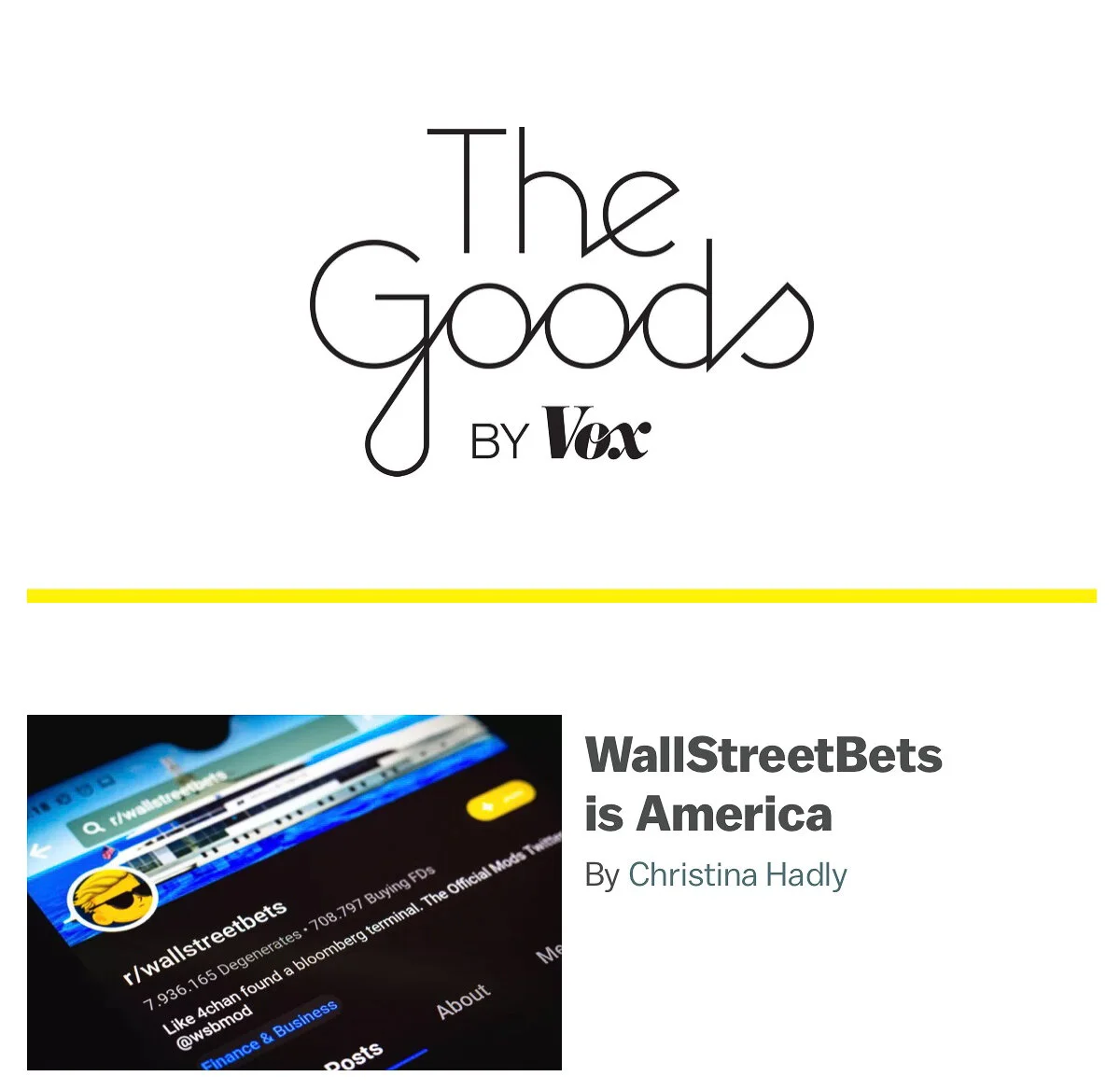 An intensely researched 3,000-word piece I wrote for Vox, examining WallStreetBets, the subreddit behind GameStop’s frenzy on the stock market. I dove deep into the different aspects of the group and what it can show us about America.